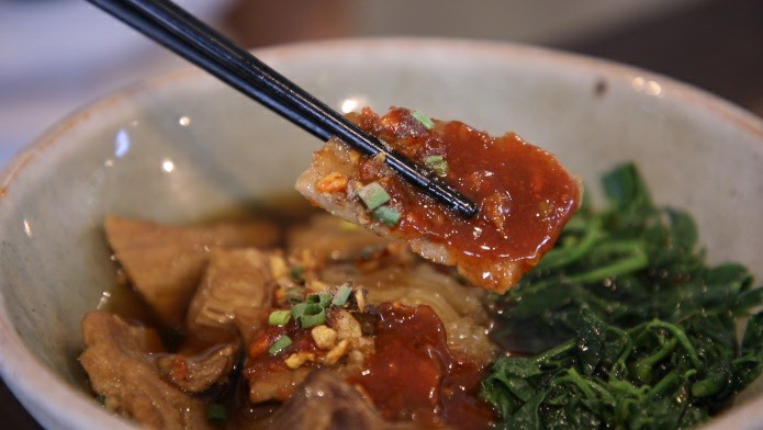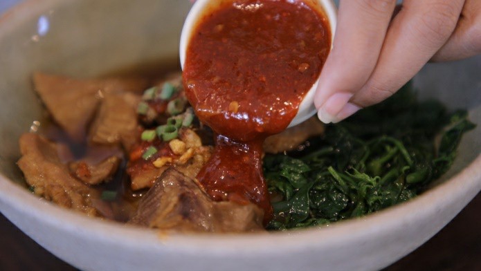 นอกจากนี้ ยังมีอีกหนึ่งทีเด็ด ที่สายเผ็ดยังต้องยอมแพ้ กับซอสเป่าปาก ที่เค้าจะดึงความเผ็ดร้อน จากพริก 2 ชนิด ทั้ง พริกกะเหรี่ยงและพริกแห้งจินดามาเสิร์ฟ จะจิ้มหรือราดผสมในก๋วยเตี๋ยว รับรองเผ็ดสะใจ