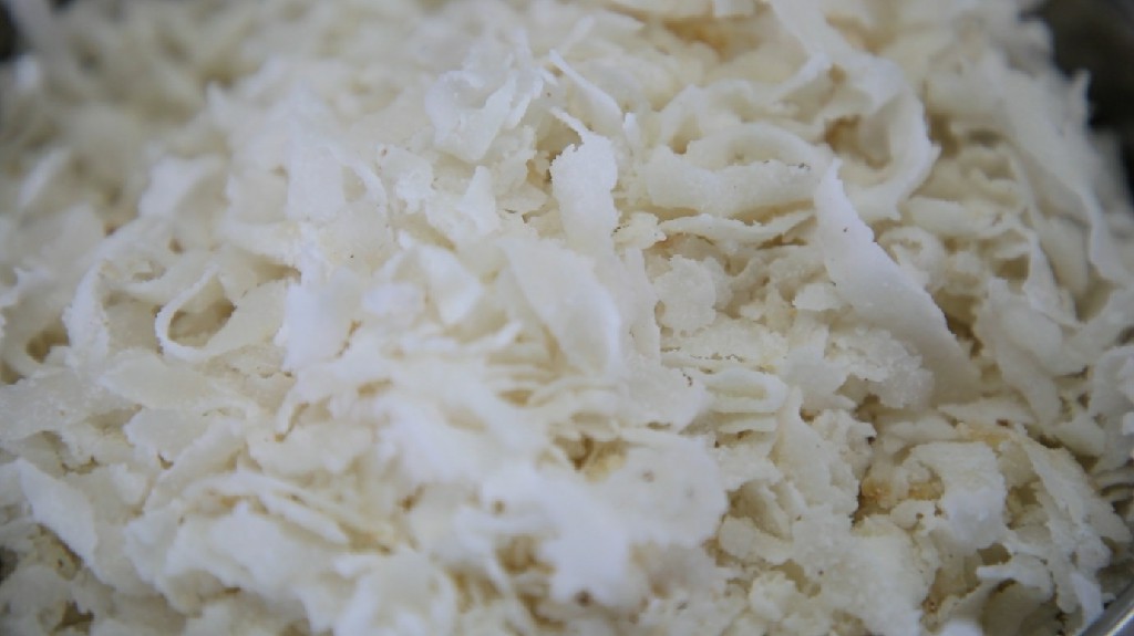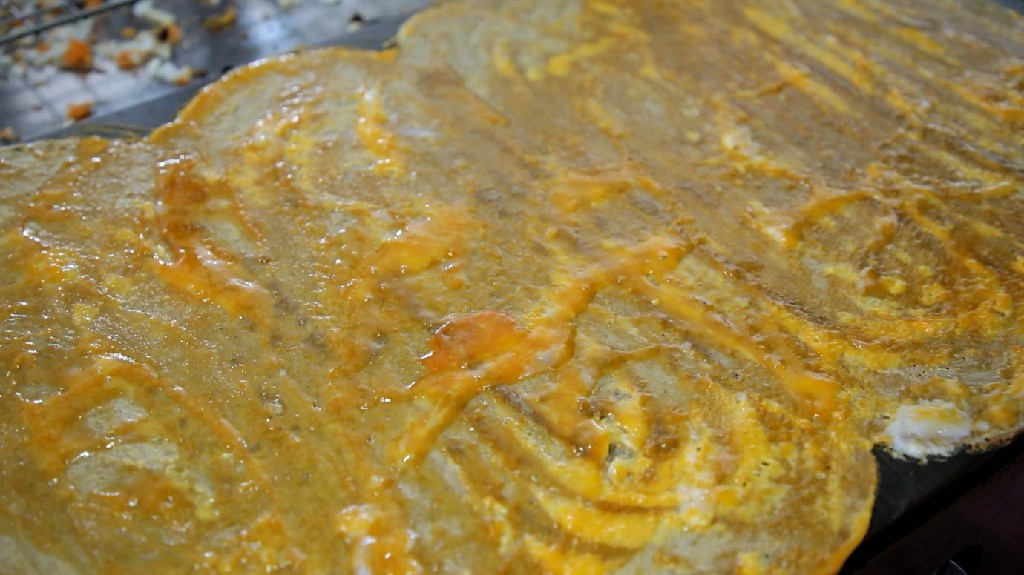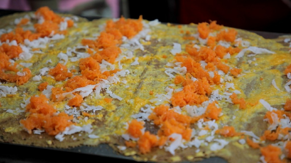 แต่ร้านนี้ เค้าจะละเลงแป้งลงไปเป็นชิ้นขนาดใหญ่เต็มพื้นที่เตา แล้วก็โรยด้วยมะพร้าวแก้วให้ทั่วๆแป้ง จากนั้น ก็จะใส่ไส้เค็ม หรือไส้หวาน ตามออเดอร์ที่ลูกค้าสั่ง และที่พิเศษไปกว่านั้น สำหรับลูกค้าที่อยากใส่ไข่ลงไปในขนมเบื้อง ที่นี่ก็มีให้ตามสั่งทีเดียว