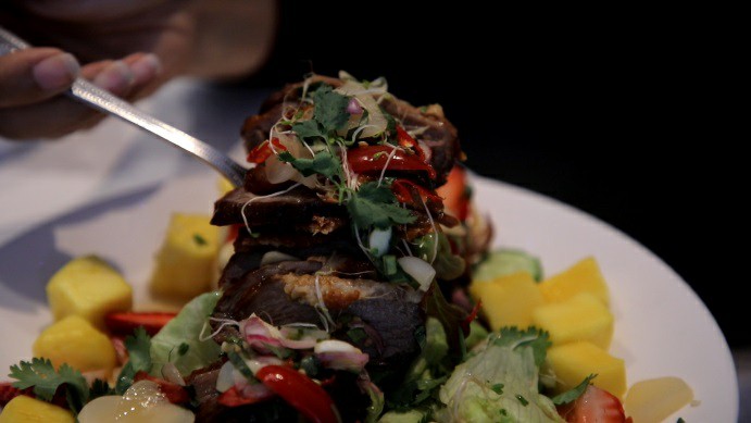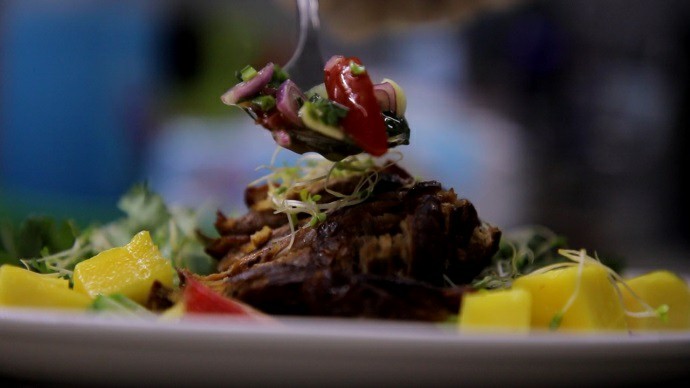 หรือจะเป็นเมนู ยำอกเป็ดกรอบสตรอว์เบอร์รี่  ที่เค้านำอกเป็ดทั้งชิ้นไปชุปแป้งทอดกรอบแบบแห้ง แล้วทอดให้เหลืองกรอบ ก่อนจะนำไปแล่เป็นชิ้นๆ เสิร์ฟคู่ไปกับน้ำยำที่ผสมน้ำกระเทียมโทนดอง ไปกับน้ำยำแบบโบราณที่ผสมน้ำตาลมะพร้าว