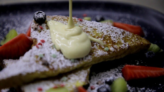 เริ่มกันที่เมนู คริสมาสต์อวกาศโทสต์ เมนูที่เป็นซิกเนอเจอร์ของร้าน ได้แรงบันดาลใจมาจาก เมนูแครมบรูว์เล ของหวานชื่อดังจากฝรั่งเศส ซึ่งจะมีเฉพาะช่วงเทศกาลเท่านั้น โดยเค้าจะนำขนมปังไปชุปไข่ให้ชุ่ม แล้วย่างให้หอม ราดด้วยซอสครีมชีสสูตรเด็ด พร้อมน้ำตาลทรายแดง ที่ถูกเบิร์นให้น้ำตาลไหม้ ให้มีสีสันสวยงาม  ตกแต่งให้ออกโทนคริสมาสต์ ดูแล้วสีสันชวนลองจริงๆ