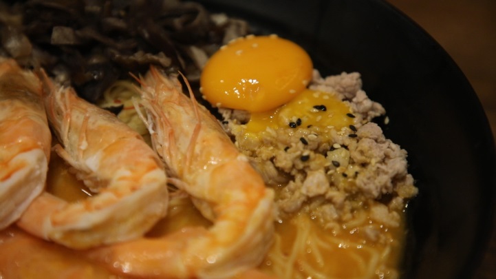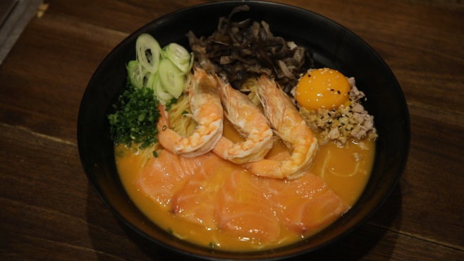 ส่วนชามใหญ่ที่เห็นอยู่นี้ จะเป็นต้มยำรวมมิตร ราเมน XL ที่ในชามจะมีเส้นราเมงถึง 3 ก้อน เสิร์ฟมาพร้อมกับ แซลมอน กุ้ง หมูสับ น้ำต้มยำแบบข่าตะไคร้ของไทย บวกกับน้ำซุปกระดูกหมูต้นตำรับจากญี่ปุ่น ที่เคี่ยวนานกว่า 24 ชั่วโมง ผสมผสานกันอย่างกลมกล่อมลงตัว