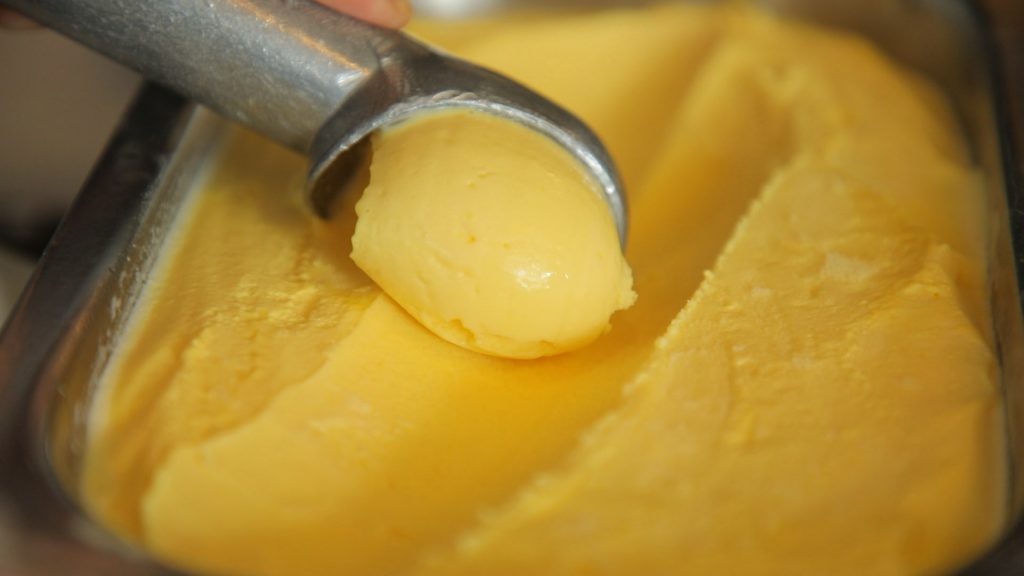 ไอศกรีมมะม่วงน้ำดอกไม้ รสชาติเข้มข้น สะใจ ซึ่งที่นี่ จะเป็นไอศกรีมมะม่วงแบบโฮมเมด ที่ใช้มะม่วงน้ำดอกไม้สดๆ และสุกจัด มาทำไอศครีม เพราะต้องการดึงกลิ่นและรสสัมผัสของเค้า ให้ออกมามากที่สุด และมะม่วงน้ำดอกไม้ที่สุกจัดนี้ จะมีกลิ่นหอมกว่าปกติ