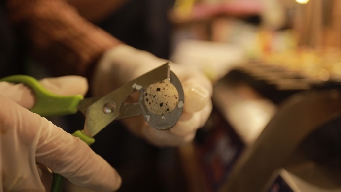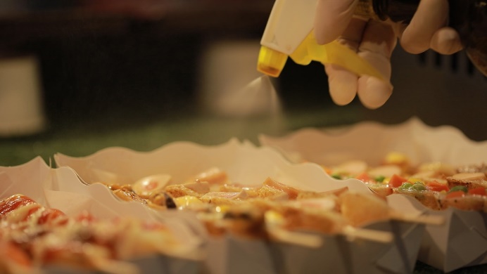 นกกระทาลงไป ตามด้วยท็อปปิ้งแต่ละหน้า มีให้เลือกถึง 12 หน้า มาวางไว้บนไข่แดงของไข่นกกระทา เพื่อเป็นจุดขาย ให้แตกต่าง ไม่มีใครเหมือน และไม่มีใครเคยทำ!!!!! และทอดจนสุกน่ากิน พ่นด้วยซอสต่างๆ ที่เลือกได้ตามใจชอบ เห็นแล้ว หน้าตาเหมือนกับพิซซ่าจิ๋วยังไงอย่างงั้น !!!!!