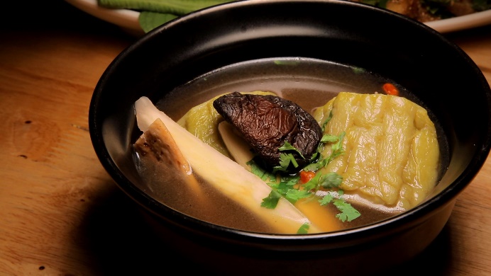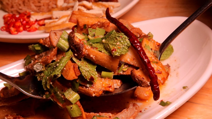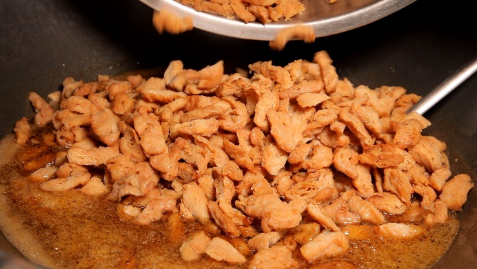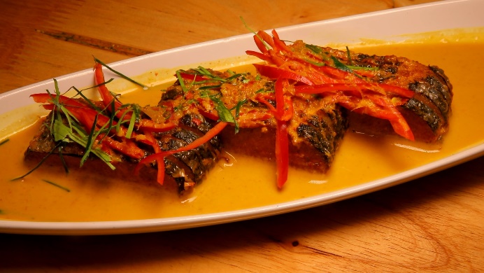ส่วนเมนูนี้ คือ ฉู่ฉี่ปลาซาบะ เนื้อปลา ทำจากโปรตีนถั่วเหลือง และโปรตีนจากข้าวสาลี แล้วนึ่งให้สุก ห่อด้วยฟองเต้าหู้และสาหร่าย เพื่อให้รสสัมผัสคล้ายหนังปลา ทอดให้เหลืองกรอบ รสสัมผัสคล้ายกินเนื้อปลาอ่อนๆ เข้มข้นไปด้วยน้ำแกงฉู่ฉี่ กินกี่คำ ก็ยังงงว่า นี่คืออาหารเจใช่มั้ย