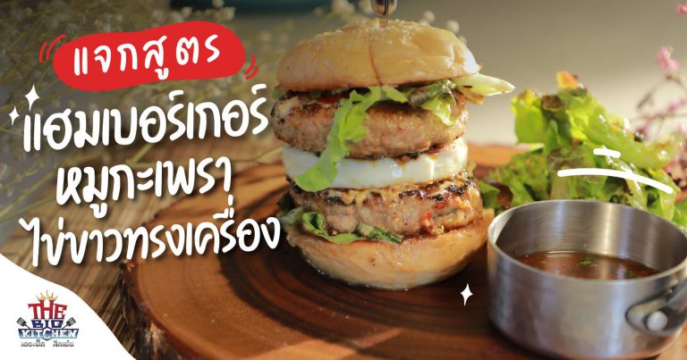 เมนู แฮมเบอร์เกอร์หมูกะเพราไข่ขาวทรงเครื่อง